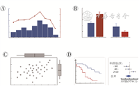 一项医学研究,可产生各类丰富的分析结果。往往单一图形展示效果有限,以图层叠加多种统计图形是常用的方法。例如:通过设置左右双纵坐标轴,将两个图形融合,在共同横轴数据上相互比较不同类别纵轴指标(图4A);多个图共用纵坐标轴,以便于横轴所示指标的相互比较(图4B);将画布网格化,每一区域可分配不同的比例,放置不同的图形,多图拼接,以全面展示数据特征(图4C);多个子图的拼装形成集成统计图形,子图内容应具有一定联系,以更为全面地展示分析结果(图4D)。