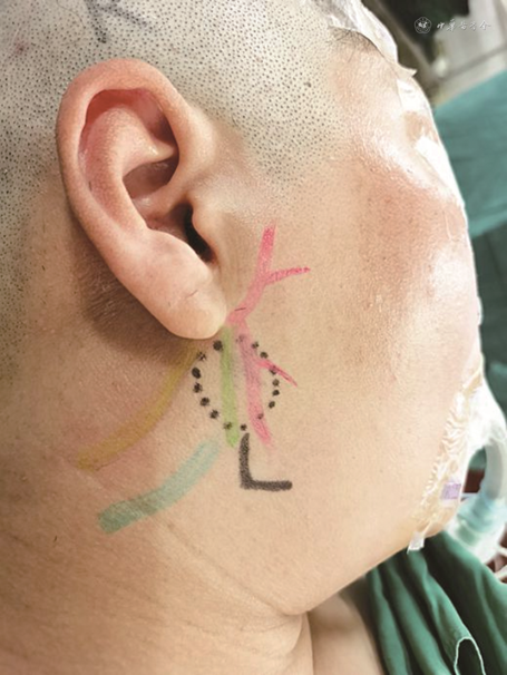 注:红色为面神经分支投影,黄色为耳大神经,深绿为颈外静脉,虚线阴影为肿物体表投影,草绿直线为切口位置及长度,L为标记的下颌角