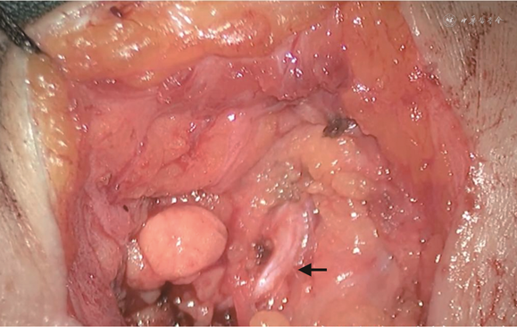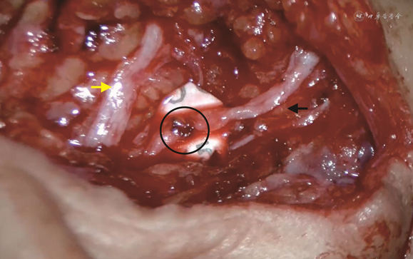 注:白色箭头所指为面神经颧支(肿瘤已切除),黑色箭头所指为面神经额支,黑圈处为面神经额支损伤处,行端端吻合,神经断端下方为垫片