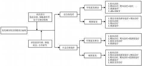 (1)早期复发者(缓解后12个月以内复发者):①临床试验;②靶向药物治疗或者靶向药物联合化疗;③挽救化疗;④直接进行allo-HSCT。