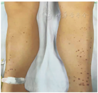 体格检查:血压114/70 mmHg(1 mmHg=0.133 kPa),身高170 cm,体重60 kg,体重指数(BMI) 20.8 kg/m2。皮下脂肪厚度:上臂4 mm、腹部11 mm、大腿7 mm。神志清,精神萎靡,嗜睡,皮肤干燥,颈部和腋下未见黑棘皮,无紫纹,躯干部及双下肢多发皮疹,粟粒样至黄豆粒大小,黄红色,部分中央部黄色颗粒大小物质,深大呼吸,双肺呼吸音清,心律齐,心音有力,腹软,肝脾肋下未及,下肢肌肉肥大(图1),四肢末梢凉。神经系统查体阴性。