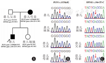 经患儿及家属知情同意,分别抽取患儿、患儿父母、患儿妹妹外周静脉抗凝血3 mL于苏州大学附属儿童医院行全外显子基因及线粒体环基因检测,基因序列结果分析显示:患儿携带PLIN1 c.1325delG (p.G442Afs*99)杂合突变和SPINK1 c.194+2T>C(p.?)杂合突变,变异均来源于母亲,PLIN1 c.1325delG(p.G442Afs*99)目前尚未见文献报道,参照美国医学遗传学和基因组学学会指南评级证据(PVS1_Mo-derate + PM2_Supporting + PP4)[4],该变异被评级为致病变异。SPINK1 c.194+2T>C(p.?)目前已有文献报道,为中国慢性特发性胰腺炎患者中最常见的致病变异[5]。外祖父母因身体原因,无法获取血液标本。患者家系图及基因测序结果见图2。