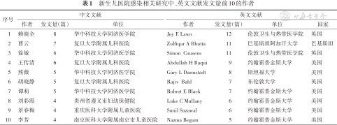 新生儿医院感染相关研究中、英文文献发文量前10的作者