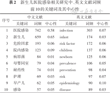 新生儿医院感染相关研究中、英文文献词频前10的关键词及其中心性