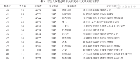 应用CiteSpace 6.1.R2中的LLR算法对中、英文文献的关键词进行聚类分析,中文文献共生成13个聚类,关键词聚类模块值Q=0.461(>0.3),平均轮廓值S=0.809(>0.5),表明关键词聚类显著,且聚类结果合理,各聚类之间存在重叠,提示各聚类之间虽有差异但关联紧密并围绕同一主题展开。其中#0危险因素、#11影响因素、#7妊娠结局、#3婴儿、#10乙型主要探讨新生儿发生院内感染的相关影响因素;#1医院感染、#2院内感染主要探讨目前新生儿院内感染发生现状;#4手卫生、#5护理管理、#6耐药性、#8消毒、#9 护理风险主要探讨新生儿院内感染预防、治疗以及护理措施;#12焦虑抑郁则探讨了新生儿发生院内感染对母亲心理状态的影响。见表3。