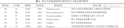 英文文献共生成 6个聚类,关键词聚类模块值Q=0.329(>0.3),平均轮廓值S=0.652(>0.5),表明关键词聚类显著,且聚类结果合理。其中#0 Pregnant women、#5 Pregnancy主要探讨孕产妇情况与新生儿感染之间的联系;#1 Nosocomial infection 主要探讨新生儿医院感染的发生、发展;#2 Neonatal mortality、#3 Neonatal spesis、#4 Children主要探讨新生儿院内感染造成的疾病负担情况。见表4。
