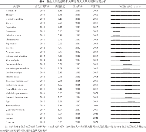 国际上有关新生儿医院感染的研究热点在2010—2011年主要为人口流行、治疗和分析;2012—2017年集中在常见细菌感染、疫苗接种方面,在分析方法上Meta分析成为常见方法,并且研究热点人群考虑到了早产儿和低体重出生儿;2017年后加入了孕产妇年龄等因素,对新生儿医院感染的发生进行综合分析,对感染流行情况的评价主要有功效和血清流行率等指标;2018年后开始对新生儿医院感染的后遗症、感染导致的疾病负担等进行研究,并且这两方面成为了近几年国际研究的主流热点,一直持续至今。见表6。