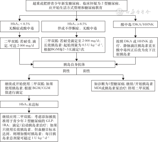 2.胰岛素:可快速改善代谢异常并能保护胰岛β细胞功能。有典型糖尿病症状[多尿、多饮、夜尿和(或)体重减轻],血糖≥13.9 mmol/L,HbA1c≥8.5%,无酸中毒症状,则应首先使用长效胰岛素治疗,同时使用二甲双胍。对于酮症/糖尿病酮症酸中毒患者,应开始皮下或静脉注射胰岛素治疗。待酸中毒纠正后,应胰岛素联合二甲双胍治疗。对于严重高血糖(血糖≥33.3 mmol/L)者,还需评估有无合并高血糖高渗性非酮症综合征。