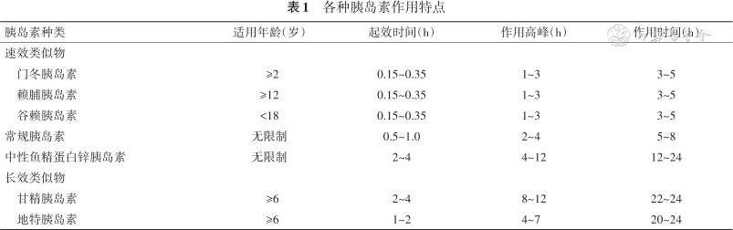 | 胰岛素种类 | 适用年龄(岁) | 起效时间(h) | 作用高峰(h) | 作用时间(h) |