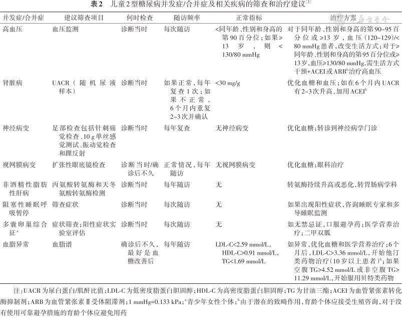 儿童及青少年T2DM较T1DM易更早出现糖尿病并发症,指南推荐管理见表2[2]。