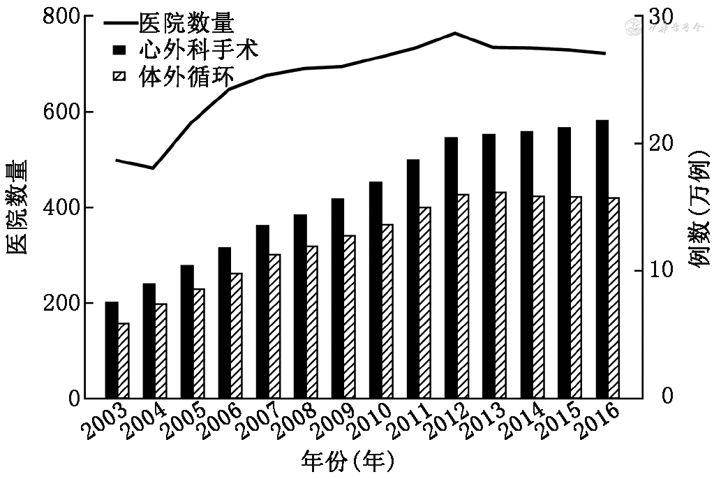 迈入21世纪,中国心血管外科手术量持续增长,为掌握行业动态,促进专业发展,ChSECC开展了中国ECC和心血管外科手术的数据调查工作。此项工作每年进行1次,对调查回收的数据进行统计分析后,公开发布“中国心脏外科和体外循环数据白皮书”[18, 19, 20, 21, 22, 23, 24],这项工作对分析行业发展趋势、引领行业发展方向起到了积极的作用,目前已成为行业权威的信息来源。例如,从图2展示的2003—2016年中国心血管外科及ECC手术开展概况可以看出,中国心血管外科手术呈逐年上升趋势。