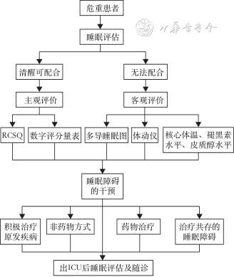 可见,对于清醒的ICU危重患者可以采用RCSQ进行主观睡眠评估,而不能完成问卷的患者可以进行体动仪监测,怀疑合并睡眠疾病者则需完善PSG监测。