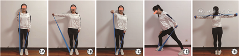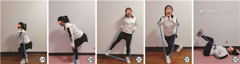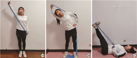 联合康复组患儿院内康复训练内容同常规康复组,在出院前接受弹力带抗阻训练指导,出院后行弹力带抗阻训练。依据患儿的烧伤部位以及肢体康复程度,由康复治疗师设计弹力带抗阻训练方案,选用轻负荷弹力带(黄色)进行练习。训练包括以下3个阶段:(1)热身阶段。6个热身动作,包括扩胸运动、开合跳、站姿转体、高抬腿、弓步蹲、原地慢跑,每个动作持续20 s。根据Borg量表[16]评分决定此阶段运动强度,使患者Borg量表评分维持在≤4分。(2)弹力带抗阻训练阶段。5个上肢动作,包括站姿臂弯举、站姿侧平举、站姿前平举、直立划船、拉伸胸肩部(图1);5个下肢动作,包括深蹲、硬拉、站姿髋外展、后弓箭步、仰卧位腿举(图2);3个核心动作,包括站姿侧拉、站姿侧弯、仰卧位屈髋(图3)。在训练时要注意保持肌肉的紧张状态,动作幅度需适中、平稳,每个动作保持3~5 s。第1~4周,每个动作8~10次为1组,每天2组;第5~8周,每个动作11~15次为1组,每天2组;第9~12周,每个动作16~20次为1组,每天2组。根据Borg量表评分决定此阶段运动强度,使患者Borg量表评分维持在6~8分。(3)放松阶段。包括拉伸颈部、上肢、肩胸、腰背和下肢,每个动作的静力拉伸时间至少持续30 s。根据Borg量表评分决定此阶段运动强度,使患者Borg量表评分≤4分。运动频率为每周3~5次。为确保患儿能熟练完成相应的弹力带抗阻动作,康复治疗师录制弹力带抗阻训练视频供患儿参考和学习。同时对患儿家长进行烧伤康复的宣传教育,强调居家运动康复对患儿生长发育和生活质量改善的重要性。出院后家长每周通过微信或电话等方式向康复治疗师或康复医师反馈患儿的训练情况。干预期间,康复治疗师根据患儿的运动视频和家长反馈的运动情况及时对患儿进行线上运动进阶指导。