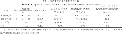 2022年1月—2023年4月,本单位收治40例符合入选标准的烧伤患儿。根据患儿或其家属的意愿将患儿分为常规康复组和联合康复组,每组各20例。研究过程中,常规康复组中的1例患儿因行瘢痕修复手术、2例患儿因体内置入皮肤软组织扩张器被排除,联合康复组中的5例患儿失访。最终有32例患儿完成全部研究,其中男11例、女21例,年龄5.8~11.7岁。2组患儿临床资料比较,差异均无统计学意义(P>0.05),见表1。