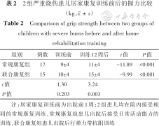 居家康复训练12周后,2组患儿的握力均明显大于居家康复训练前(P<0.05),且联合康复组患儿的握力明显大于常规康复组(P<0.05),见表2。