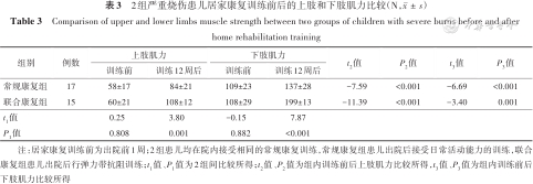 2组严重烧伤患儿居家康复训练前后的上肢和下肢肌力比较(N,)