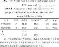 2组严重烧伤患儿居家康复训练前后的瘦体重比较(kg,)
