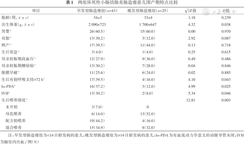 | 项目 | 早发型肠造瘘组(n=43) | 晚发型肠造瘘组(n=25) | χ2/Z值 | P值 |