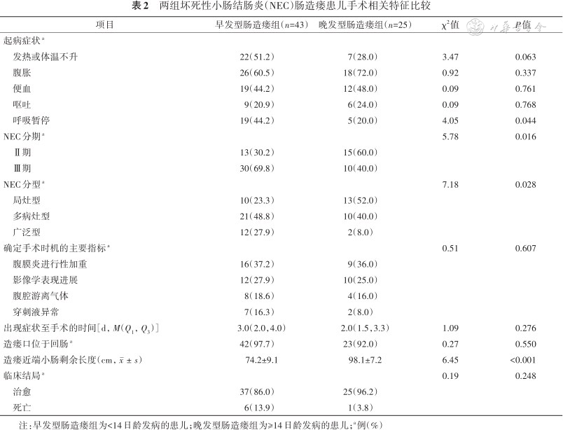 | 项目 | 早发型肠造瘘组(n=43) | 晚发型肠造瘘组(n=25) | χ2值 | P值 |