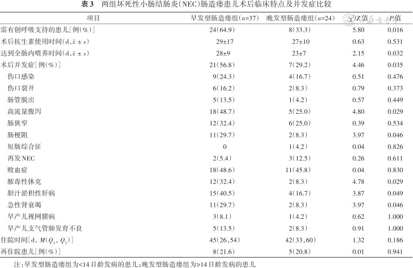 | 项目 | 早发型肠造瘘组(n=37) | 晚发型肠造瘘组(n=24) | χ2/Z值 | P值 |