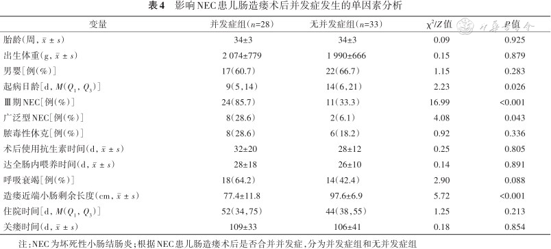 4. 影响并发症组和无并发症组患儿结局的单因素分析:与无并发症组患儿相比,并发症组起病日龄、Ⅲ期NEC、广泛型NEC、造瘘近端小肠剩余长度间的差异均有统计学意义(均P<0.05)。两组患儿胎龄、出生体重、性别、是否合并脓毒性休克、是否需要有创呼吸支持、住院时长、关瘘时间等差异均无统计学意义(均P>0.05,表4)。