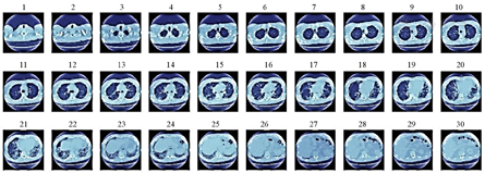 本研究中使用的数据集来自开源成像联盟(open source imaging consortium,OSIC)肺纤维化进展比赛[24],且已获得组织者的授权和许可,以确保数据集的合法性和知识产权保护。在使用数据集时严格遵守适用的法律、法规和隐私保护政策。数据集包含176组患者的胸部CT扫描(图1)和相关临床文本信息(表1)。在0周时采集患者CT图像,并在1~2年的过程中进行多次随访。相关临床文本信息包括患者ID、百分比、年龄、FVC、性别、周数和吸烟状态,其中百分比表示每个患者的FVC相对于同年龄、同性别和同吸烟状态的人群中典型的FVC水平,周数是指与基线CT扫描的相对周数(可能为负数),吸烟状态分为从未吸烟、目前吸烟和曾经吸烟。
