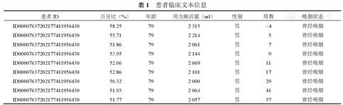 | 患者ID | 百分比(%) | 年龄 | 用力肺活量(ml) | 性别 | 周数 | 吸烟状态 |