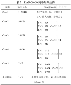 ResNeXt-50网络层数结构见表2,总体包括5个卷积层。先通过conv1层的7×7卷积,再由conv2层中3×3的卷积核进行下采样,然后重复堆叠残差网络的Block结构,堆叠的个数分别是3、4、6、3,再通过全局平均池化下采样,全连接层连接,最后经由Softmax层激活将分类结果输出。中间堆叠残差神经网络的分组个数C(基数)为32,每一组通道数为4。
