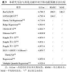 如表5所示,本研究使用了15种不同的卷积神经网络架构(包括5种ResNet、2种ResNeXt和8种EfficientNet)进行实验评估。本研究设计的肺功能预测方法的LLLm为−6.706 5、RMSE为184.5和MAE为146.2,在性能上优于其他方法。与LSTM-QRNN、Elastic Net Regression、Ridge Regression、CBAM-ICA、Fibrosis-Net以及在Kaggle竞赛中获得前3名的方法相比,本研究方法具有更好的预测准确性。