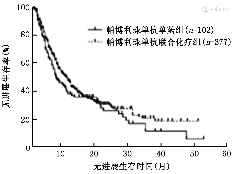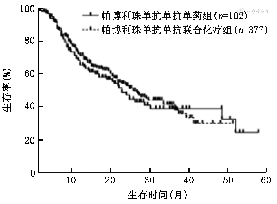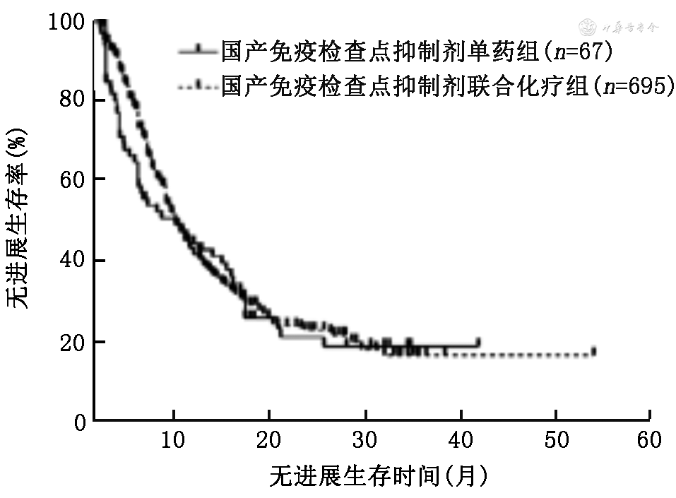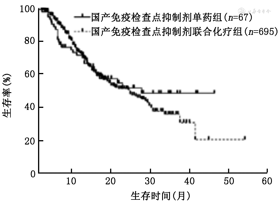 4.使用国产ICI和帕博利珠单抗单药与免疫联合化疗患者的PFS和OS比较:使用国产ICI单药组和免疫联合化疗的中位PFS分别为9.0(95%CI:3.0~15.0)个月和9.0(95%CI:8.2~9.8)个月,差异无统计学意义(χ2=0.45,P=0.502;图5);中位OS分别为27.0(95%CI:25.0~29.0)个月和24.0(95%CI:19.1~28.9)个月,差异无统计学意义(χ2=0.29,P=0.591;图6)。使用帕博利珠单抗患者单药组和免疫联合化疗的中位PFS分别为7.4(95%CI:4.8~9.8)个月和10.5(95%CI:9.0~12.0)个月,差异无统计学意义(χ2=1.92,P=0.166;图7);OS分别为22.0(95%CI:17.1~26.9)个月和26.0(95%CI:21.3~30.7)个月,差异无统计学意义(χ2=0.27,P=0.600;图8)。