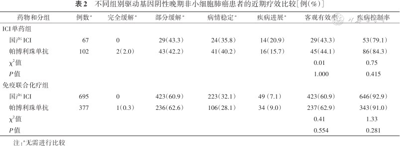 不同组别驱动基因阴性晚期非小细胞肺癌患者的近期疗效比较[例(%)]