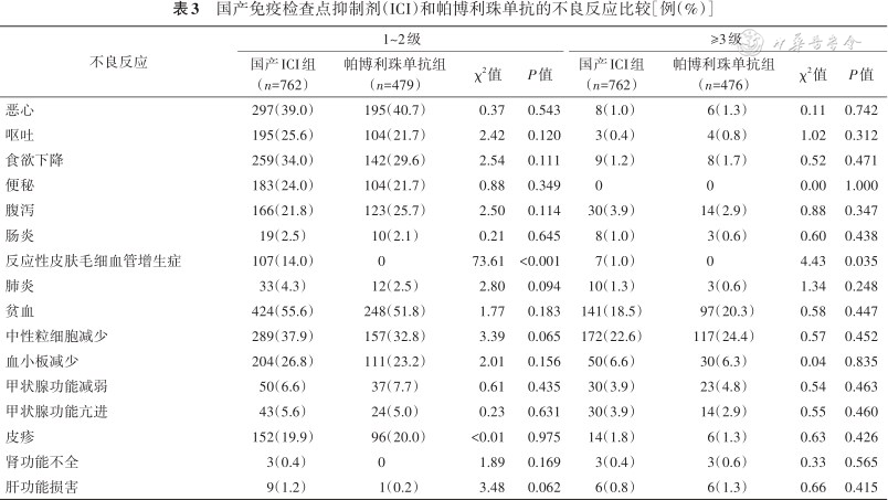 5.国产ICI和帕博利珠单抗药物不良反应的比较:由表3可见,无论是国产ICI,还是帕博利珠单抗,药物所致不良反应均以1~2级为主,≥3级不良反应少见。国产ICI组和帕博利珠单抗组1~2级反应性皮肤毛细血管增生症的发生率分别为14.0%和0,≥3级反应性皮肤毛细血管增生症的发生率分别为1.0%和0,差异均有统计学意义(P<0.01,P=0.048)。国产ICI和帕博利珠单抗均有不同程度的恶心、呕吐、食欲下降、便秘、腹泻、肠炎、肺炎、贫血、中性粒细胞减少、血小板减少、甲状腺功能减弱、甲状腺功能亢进、皮疹、肾功能不全、肝功能损害等不良反应,但发生率差异均无统计学意义(均P>0.05)。