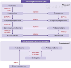 高水平的雄激素是PCOS的主要缺陷。胆固醇通过一系列类固醇生成器官共有的酶级联反应转化为雄激素,组织特异性变异导致类固醇激素谱不同。在PCOS中,通过经典途径增加卵巢雄激素的产生是由垂体LH的分泌增加、胰岛素作为共促性腺激素的作用和鞘细胞对LH的超敏反应增加所驱动的。图2总结了类固醇生成的经典途径。胆固醇通过一系列反应转化为脱氢表雄酮(DHEA),然后通过3β-羟类固醇脱氢酶2型(3β-HSD2)转化为雄烯二酮,随后通过醛酮还原酶1成员C3(AKR1C3)转化为睾酮。