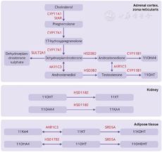 其他肾上腺雄激素也过量分泌,包括11β-羟雄烯二酮和11β-羟睾酮。肾上腺雄激素11β-羟雄烯二酮含量丰富,但由于其弱雄激素活性,既往认为其几乎没有生理重要性。然而,最近的研究表明,由于碳-11上存在氧原子,11β-羟雄烯二酮可代谢为11-酮睾酮和11-酮二氢睾酮,称为11-氧雄激素。11-酮睾酮和11-酮二氢睾酮与雄激素受体结合的亲和力和效力与睾酮和双氢睾酮相似。质谱分析显示,11-氧雄激素是PCOS女性的主要循环雄激素,并与代谢风险标志物显著相关。11-氧雄激素的合成依赖于肾上腺源性雄激素的外周活化(图3)。11β-HSD2是一种由肾脏表达的酶,可将11β-羟雄烯二酮转化为11-酮雄烯二酮,并将11β-羟睾酮转化为11-酮睾酮。然而,脂肪组织也有负责雄激素形成的酶,可能是循环中11-氧雄激素的主要来源。