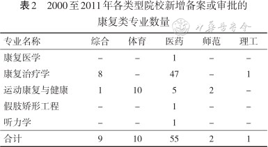 2000至2011年各类型院校新增备案或审批的康复类专业数量