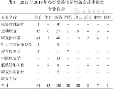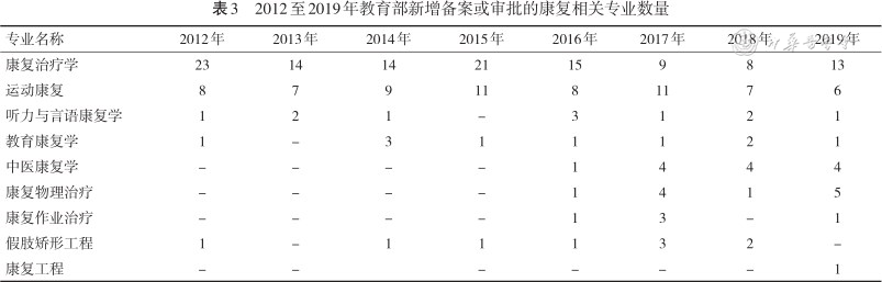 2012至2019年间,康复相关专业中新增备案或审批类专业数量大幅提升(表3),其中康复治疗学专业累计新增117个,占康复相关专业新增总数的48.35%;运动康复累计新增67个,占康复相关专业新增总数的27.69%;中医康复学累计新增13个,占康复相关专业新增总数的5.37%。此外,2015年南京特殊教育师范学院、上海健康医学院在获教育部备案时首批设置3个康复相关专业,其中南京特殊教育师范学院首批设置康复治疗学和教育康复学专业,上海健康医学院首批设置康复治疗学专业;2017年滇西应用技术大学在获教育部备案时首批设置康复治疗学专业。