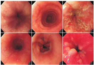 患儿均完善消化道内镜检查,5例患儿内镜下表现正常(27.78%),其余患儿内镜下可见食管黏膜异常:食管黏膜粗糙9例(50.00%);糜烂5例(27.78%);黏膜充血红斑5例(27.78%);环状改变2例,犁沟样改变1例,皱纸样改变1例(共占22.22%);线性溃疡2例;食管黏膜颗粒样改变2例;3例可见食管黏膜隆起呈息肉样改变,最大者0.7 cm×0.8 cm;5例可见齿状线粗糙或齿状线欠清晰;贲门口松弛3例(图1)。