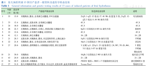 胎儿胸腔积液13例引产患者一般资料及遗传学检查结果