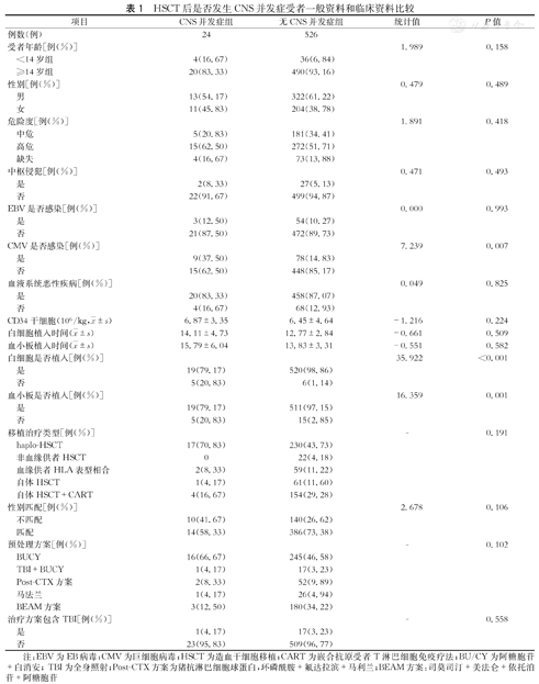 550例HSCT受者中的24例发生了CNS并发症,总体发生率4.36%。根据是否发生CNS并发症分为CNS组(24例)和无CNS组(526例)。CNS组年龄28岁(5~66岁),其中,<14岁有4例,≥14岁有24例;无CNS组;年龄38岁(2~71岁),其中,<14岁有36例,≥14岁有490例。CNS组男13例,女11例;无CNS组;男322例;女204例。两组在年龄、性别、疾病危险程度、中枢神经系统侵犯等临床特征比较,差异均无统计学意义(表1)。