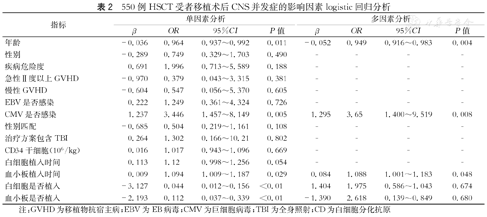550例HSCT受者移植术后CNS并发症的影响因素logistic回归分析