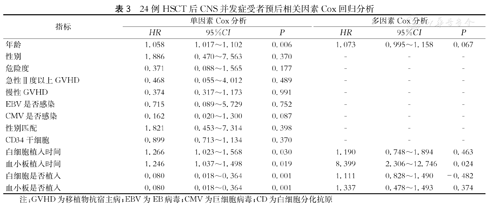 24例HSCT后CNS并发症受者预后相关因素Cox回归分析