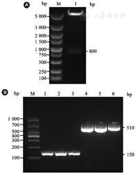 注:A:质粒pGEX-6P-1-KPC-2双酶切鉴定(M: DNA Marker DL5000; 1:双酶切片段);B: KPC-2阳性肺炎克雷伯菌鉴定[M: DNA Marker DL1000; 1~3(引物F1, R1):菌株SRT、64、12; 4~6(引物F2, R2):菌株SRT、64、12]