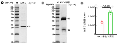 工程菌pGEX-6P-1-KPC-2/BL21(DE3)经0.1 mmol/L IPTG,16℃诱导16~18 h。收获菌体纯化目的蛋白,SDS-PAGE检测结果显示目的条带相对分子质量(Mr)为29×103(图2A),与目的蛋白KPC-2的理论Mr相符。KPC-2蛋白免疫新西兰兔后,分离的血清经Protein G纯化获得KPC-2多克隆抗体,SDS-PAGE检测结果显示出两个条带(图2B),其中重链Mr为53×103,轻链Mr为22×103,Mr大小与兔IgG轻、重链理论Mr相符。BCA法检测KPC-2多抗浓度为4.5 mg/ml,ELISA检测抗体效价为160 000。为了进一步检验提取的多克隆抗体是否具有功能活性,采用调理吞噬杀菌试验检测抗体活性。结果显示抗体组细菌存活数量与对照组相比差异有统计学意义(图2C, t=8.342, P<0.001),结果证明分离的KPC-2多抗具有体外杀菌活性。