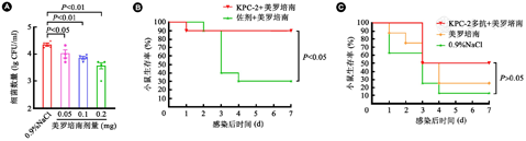 注:A:抗生素治疗剂量筛选;B:免疫后致死剂量SRT菌株感染并给予美罗培南治疗后,小鼠的生存率;C:致死剂量SRT菌株感染并给予KPC-2多抗及美罗培南治疗后,小鼠的生存率