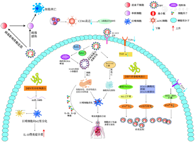 细胞因子风暴造成的多器官功能损伤是SFTS患者重症化及临床死亡的重要原因,IL-6、IL-10、TNF-α、IFN-γ等炎性介质在SFTS患者中明显升高[31],巨噬细胞作为非特异免疫细胞是机体IL-1β、IL-6、IL-12和IL-23等炎症因子的主要来源细胞之一。DBV感染THP-1细胞可直接诱导TNF-α、IL-1β和IL-6生成[28],DBV的非结构蛋白可通过激活NF-κB诱导炎症因子释放[32],这是DBV促进细胞因子风暴形成、诱导机体损伤的重要途径。除了常见的炎症通路,近来发现,单核/巨噬细胞焦亡也参与DBV诱导的细胞因子风暴形成。焦亡是一种炎症细胞程序性死亡方式,主要通过各种炎症小体(如NLRP3)介导caspase半胱氨酸蛋白酶激活,造成细胞穿孔,胞质内容物流出,并伴随着大量促炎因子(IL-1β和IL-18)释放。研究显示,DBV感染THP-1细胞后可通过诱导BAK/BAX上调,使线粒体DNA释放到细胞质基质,激活焦亡,进一步的动物实验表明,焦亡引发的炎症能增加小鼠的病死率[33,34]。
