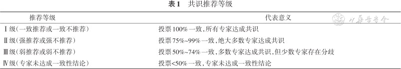 本共识根据专家组投票的一致性将推荐等级分为Ⅰ~Ⅳ级,推荐等级见表1。