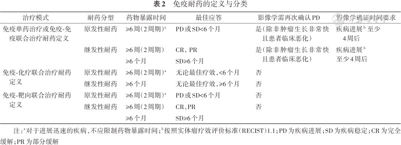 区分免疫原发耐药和继发耐药关系着耐药后的治疗决策,目前临床实践中对于继发性耐药的判定尚存在争议,2021年ESMO对于免疫获得性耐药的定义中排除了疗效评估为SD的患者,同时对缓解持续时间不做要求,并且提出应答后出现的进展无需再次影像学确认[6]。此外,在免疫耐药后的临床研究中入组的继发性耐药患者也包含了不同免疫治疗暴露时长,如3个月、2个治疗周期等。因此,对于免疫治疗原发和继发性耐药的定义进行统一有利于临床研究入组人群的一致性和临床实践工作的开展,经专家组讨论后形成以下共识(推荐意见 1和表2)。