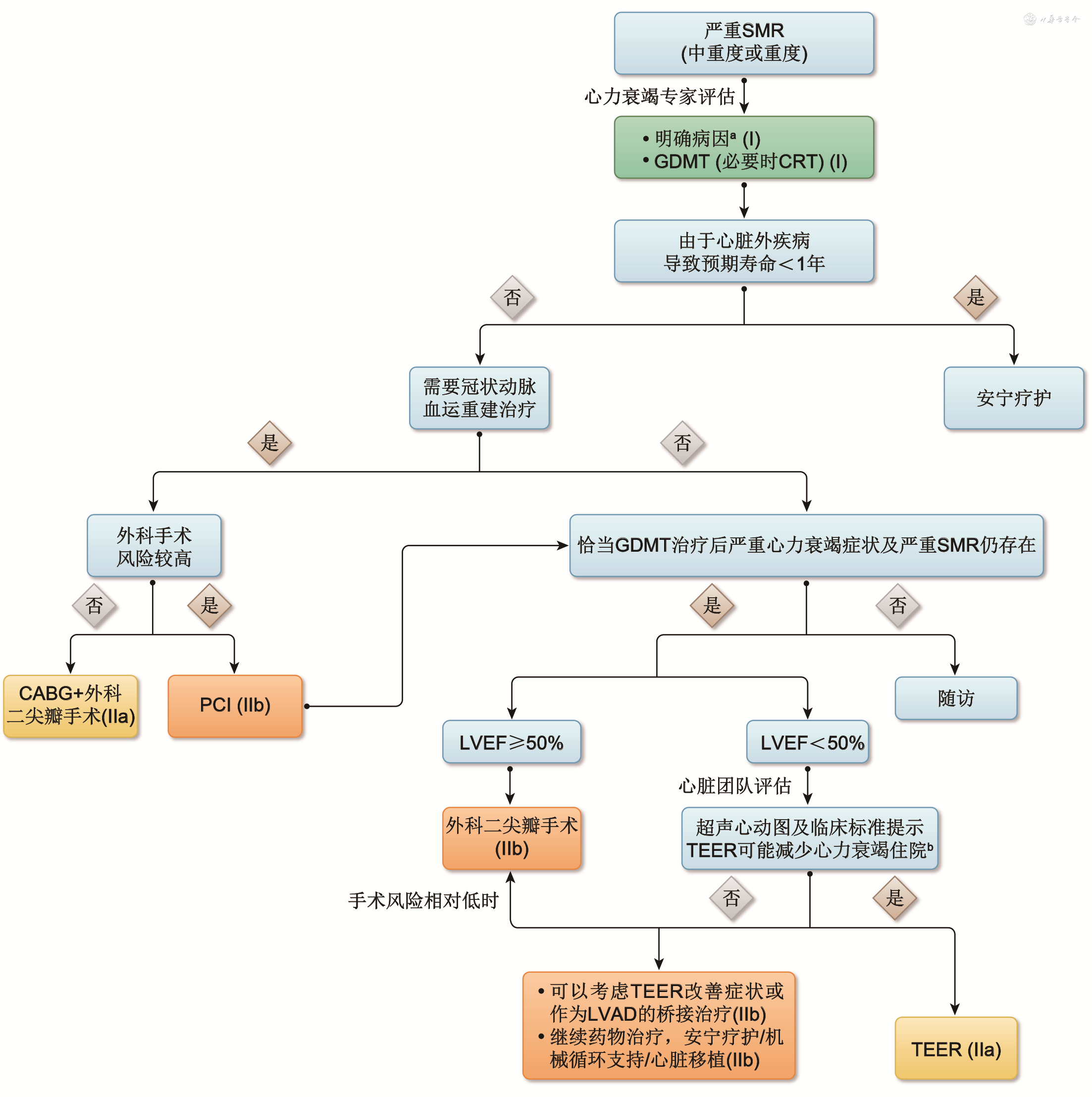 3. HCM的治疗。(1)药物治疗:症状性梗阻性HCM的药物治疗首选无血管扩张作用的β受体阻滞剂(如比索洛尔或美托洛尔),并滴定至MTD,改善患者症状(Ⅰ类推荐,B级证据);对于β受体阻滞剂治疗无法耐受或有禁忌证的症状性梗阻性HCM患者,推荐应用非二氢吡啶类CCB(如维拉帕米或地尔硫卓),并滴定至MTD,改善患者症状(Ⅰ类推荐,B级证据);对于应用β受体阻滞剂或非二氢吡啶类CCB后仍有症状(NYHA心功能分级Ⅱ级或Ⅲ级)的患者,应该考虑在超声心动图监测LVEF情况下应用心肌肌球蛋白抑制剂mavacamten,并滴定至MTD,改善患者症状,可以与β受体阻滞剂或非二氢吡啶类CCB联合(Ⅱa类推荐,A级证据),或者作为单药治疗(Ⅱa类推荐,B级证据)。对于部分无症状的梗阻性HCM患者,可以考虑应用β受体阻滞剂或维拉帕米来降低LVOT峰值压差(Ⅱb类推荐,C级证据);对于伴有劳力性呼吸困难症状的梗阻性HCM患者,可以考虑谨慎应用低剂量利尿剂治疗(Ⅱb类推荐,C级证据)。(2)室间隔减容术(septal reduction therapy,SRT),主要包括外科室间隔心肌切除术(surgical septal myectomy,SSM)及经皮腔内室间隔心肌消融术(percutaneous transluminal septal myocardial ablation,PTSMA)两种方式,对于符合SRT的适应证(最大剂量药物治疗后NYHA心功能分级Ⅲ级或Ⅳ级,静息或激发LVOT峰值压差≥50 mmHg),能接受心脏外科手术的患者,推荐在有经验的医学中心,由有经验的术者行SSM(Ⅰ类推荐,B级证据);对于符合SRT的适应证,但是由于高龄或严重合并症,考虑SSM手术高危或禁忌而不能接受SSM,或不愿接受SSM的患者,推荐行PTSMA(Ⅰ类推荐,B级证据)作为SSM的替代方式,主要方式为酒精室间隔消融术(alcohol septal ablation,ASA)。(3)SCD的预防:既往发生过心脏骤停或室性心律失常导致的血液动力学不稳定或“复苏的”SCD事件的患者,推荐植入ICD进行二级预防(Ⅰ类推荐,B级证据);既往未发生过上述事件,但是存在≥1项SCD主要危险因素(早发HCM相关的家族史、近期不明原因晕厥、左心室极度肥厚、非持续性室速、LVEF≤50%、左心室心尖部室壁瘤及CMR检查的心肌纤维化)或SCD风险预测模型评估为高危(5年SCD发生风险>6%),应该考虑植入ICD进行一级预防(Ⅱa类推荐,B级证据)。(4)终末期HCM的治疗:药物治疗参考HFrEF的治疗,由于终末期HCM患者SCD的发生率高,应该考虑植入ICD预防SCD(Ⅱa类推荐,C级证据)。对于合并难治性心衰或反复发作室性心律失常的终末期HCM患者,推荐进入心脏移植评估(Ⅰ类推荐,B级证据)[491]。