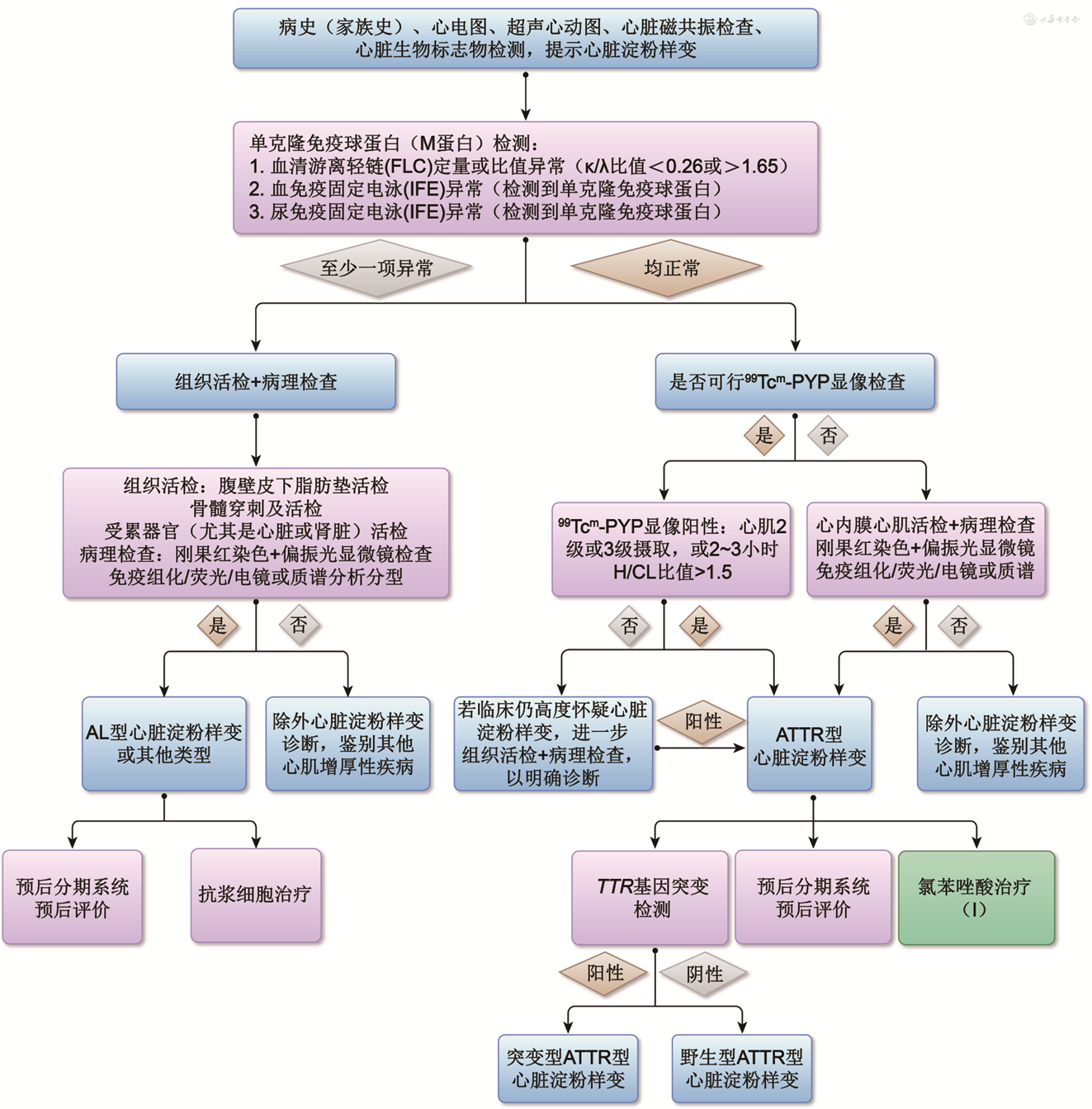 | 心脏淀粉样变 | 是一组由特定淀粉样纤维蛋白前体发生错误折叠、聚集,形成不溶性的淀粉样纤维在心肌细胞外的间质沉积,导致心脏结构和功能异常,临床主要表现为心衰和心律失常等,常伴有多种心脏外表现的系统性淀粉样变 | 诊断流程大致分为3步:(1)确定诊断,(2)确定分型,(3)根据预后分期系统进行预后评价 常见类型是免疫球蛋白轻链型CA(AL型CA)和转甲状腺素蛋白型CA(ATTR型CA),AL型CA根据受累免疫球蛋白轻链类型可以分为λ轻链型和κ轻链型,ATTR型CA根据是否存在TTR基因致病变异,可以分为突变型(ATTRm型CA)和野生型(ATTRwt型CA) | (1) 对症治疗: 针对合并心力衰竭和心律失常治疗 (2) 病因治疗: 针对AL型和ATTR型的病因治疗 |