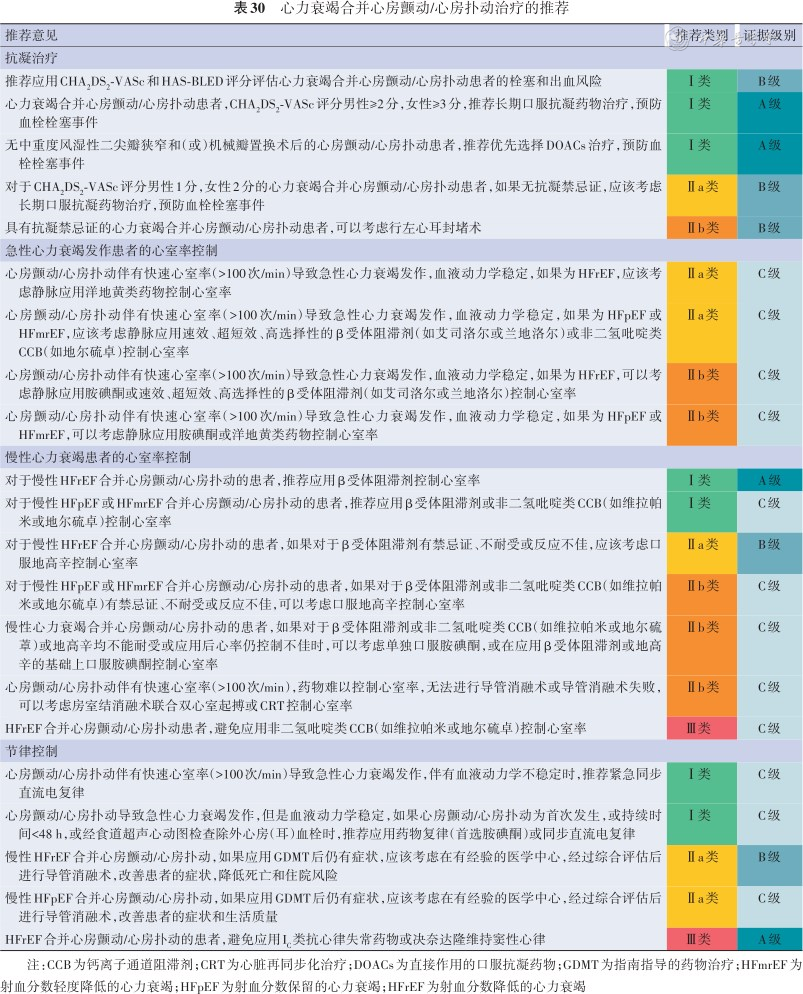 产后能否哺乳有争议,应个体化处理。LVEF<35%或NYHA心功能分级III或Ⅳ级的患者不推荐哺乳。不哺乳可以应用所有的抗心衰药物。哺乳期可以应用的药物:袢利尿剂、美托洛尔、肼苯哒嗪或硝酸酯类药物、地高辛、ACEI(如那普利、贝那普利、卡托普利)、MRA(如螺内酯)、LMWH、华法林。禁止应用的药物:SGLT-2抑制剂、ARB、ARNI、伊伐布雷定、维立西呱、曲美他嗪及DOACs [307,482]。抗心衰药物至少应持续应用至心功能完全恢复后的12~24个月,GDMT可能需要长期用药,但证据不足。妊娠期和产后早期血栓栓塞发生率增加,LVEF显著降低的患者心腔血栓形成风险显著增高。围生期LVEF<30%的AHF患者可以考虑进行抗凝治疗,特别是在产后高凝状态最为明显的前6~8周,但疗效和安全性尚不明确(IIb类推荐,C级证据)。对于影像学检查发现有心腔内血栓或临床有系统性血栓栓塞证据或心衰合并房颤的患者,建议给予治疗剂量的抗凝方案。在妊娠的前3个月和最后3个月应用LMWH,妊娠中期可以应用华法林或LMWH,避免应用DOACs[307]。